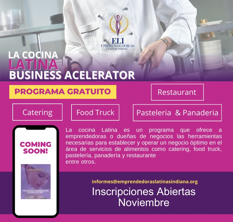 Mi Cocina Latina es un programa de aceleración empresarial diseñado por Emprendedoras Latinas en Indiana (ELI) para fortalecer emprendimientos gastronómicos liderados por mujeres hispanas. Esta iniciativa brinda capacitación técnica, acompañamiento personalizado, acceso a certificaciones esenciales y conexión con una red de apoyo empresarial multicultural.Gracias al respaldo de LISC Indianapolis, Latino Business Support Network y la Central Indiana Community Foundation, este programa ofrece formación gratuita y especializada en temas críticos para la sostenibilidad del negocio culinario.