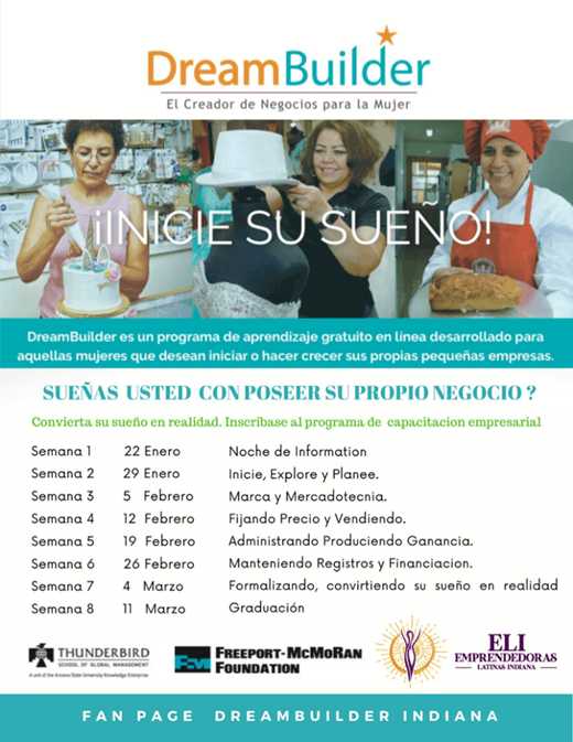 Emprendedoras Latinas en Indiana (ELI) presenta DreamBuilder Academy, un programa de formación empresarial diseñado exclusivamente para mujeres que desean iniciar o fortalecer su emprendimiento. Esta iniciativa se lleva a cabo de forma virtual e interactiva, en colaboración con Thunderbird School of Global Management de Arizona State University y Freeport-McMoRan Foundation.